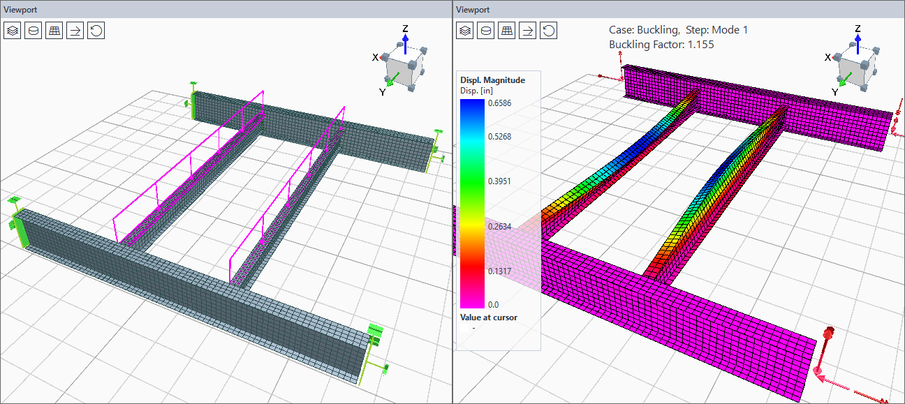 El análisis de pandeo basado en FEM de secciones de acero ahora está disponible a través del plugin integrado BucklingFEM. Los elementos de marcos de acero pueden convertirse en modelos FEM detallados para el análisis de pandeo por eigenvalores. Esto permite capturar tanto los modos de pandeo globales como locales, proporcionando una evaluación más realista de la estabilidad de los miembros en comparación con las verificaciones simplificadas tradicionales. Esta función está limitada a la licencia de nivel Ultimate.