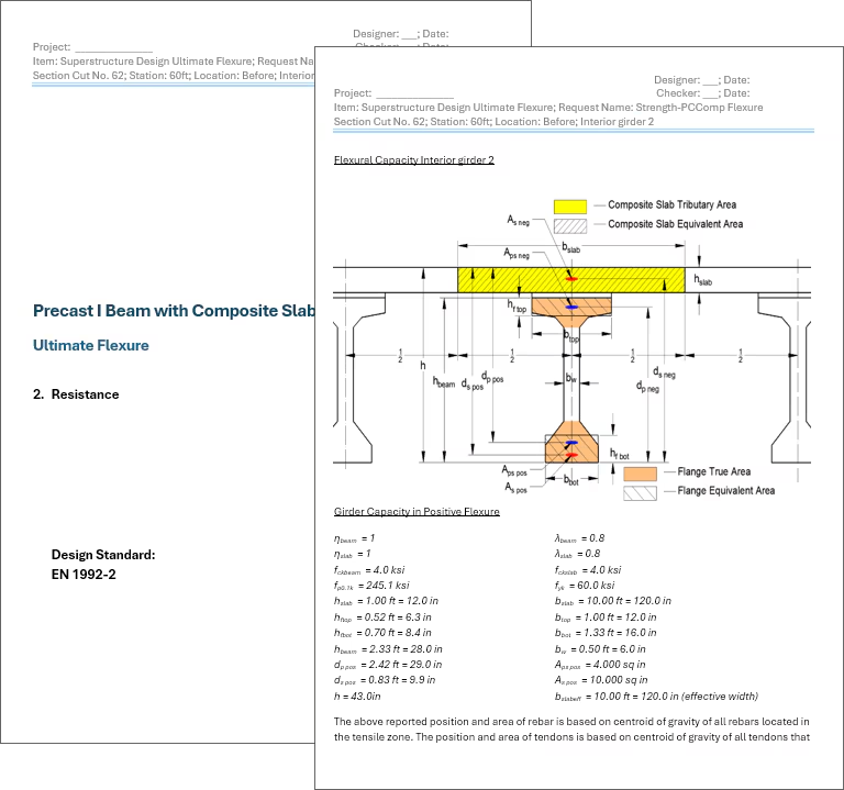 Están disponibles informes de cálculo exhaustivos en formato Word para puentes mixtos de concreto prefabricado, diseñados de conformidad con el Eurocódigo EN 1992-2.